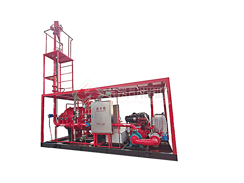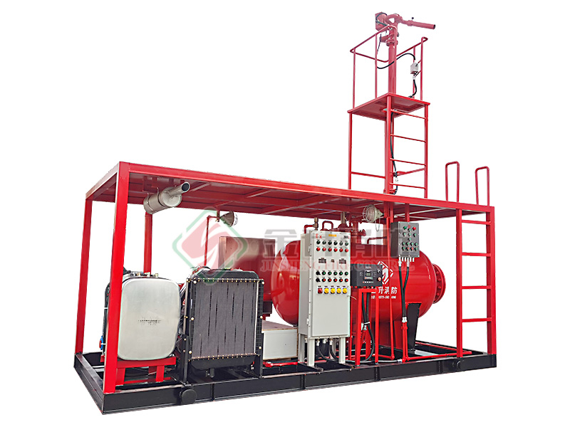 撬裝泡沫滅火裝置主要柴油機(jī)(電動(dòng)機(jī))消防泵組、壓力式比例混合裝置(或泡沫液儲(chǔ)罐)、噴射系統(tǒng)(防爆電動(dòng)消防炮)、公共底座、防雨棚、操作平臺(tái)及爬梯、防爆控制柜、消防器材箱、消防水帶、泡沫槍與連接管路等組成。機(jī)組采用柴油機(jī)(或電動(dòng)機(jī))為動(dòng)力。